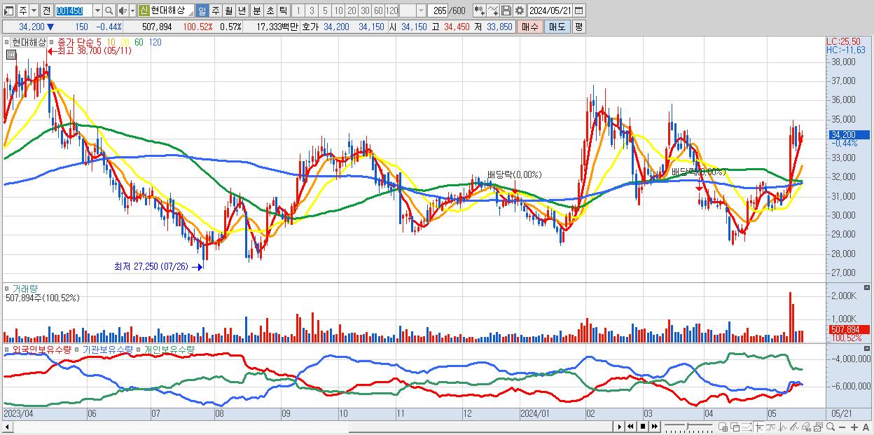 - 현대해상 (34,200원 ▼ -0.44% , 시총: 30,575억, 외국인 순매수 거래금:51억)