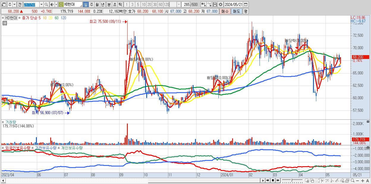 - HD현대 (68,200원 ▲ 0.74% , 시총: 53,873억, 외국인 순매수 거래금:46억)