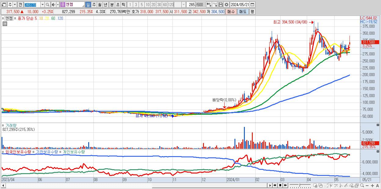 - 엔켐 (317,500원 ▲ 3.25% , 시총: 60,609억, 외국인 순매수 거래금:382억)