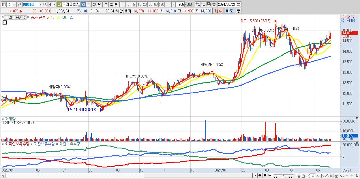 - 우리금융지주 (14,870원 ▲ 0.88% , 시총: 110,423억, 외국인 순매수 거래금:56억)