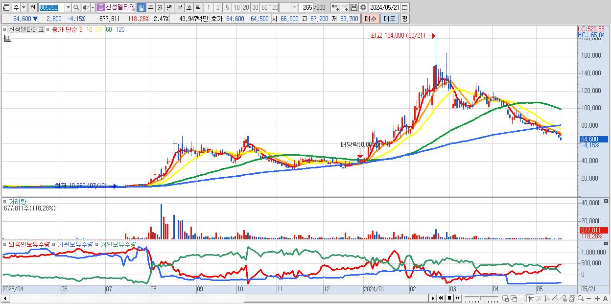 - 신성델타테크 (64,600원 ▼ -4.15% , 시총: 17,755억, 외국인 순매수 거래금:64억)