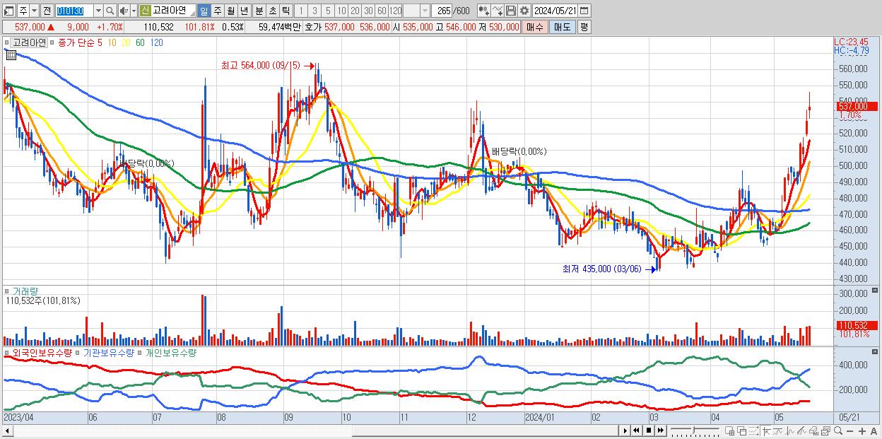 - 고려아연 (537,000원 ▲ 1.7% , 시총: 112,279억, 외국인 순매수 거래금:70억)