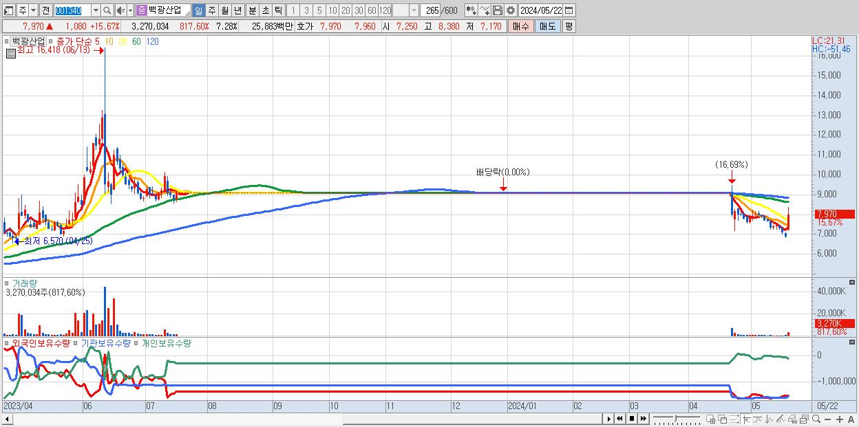 - 백광산업 (7,970원 ▲ 15.67% , 시총: 3,580억, 거래량: 3,270,034, 거래대금:259억)