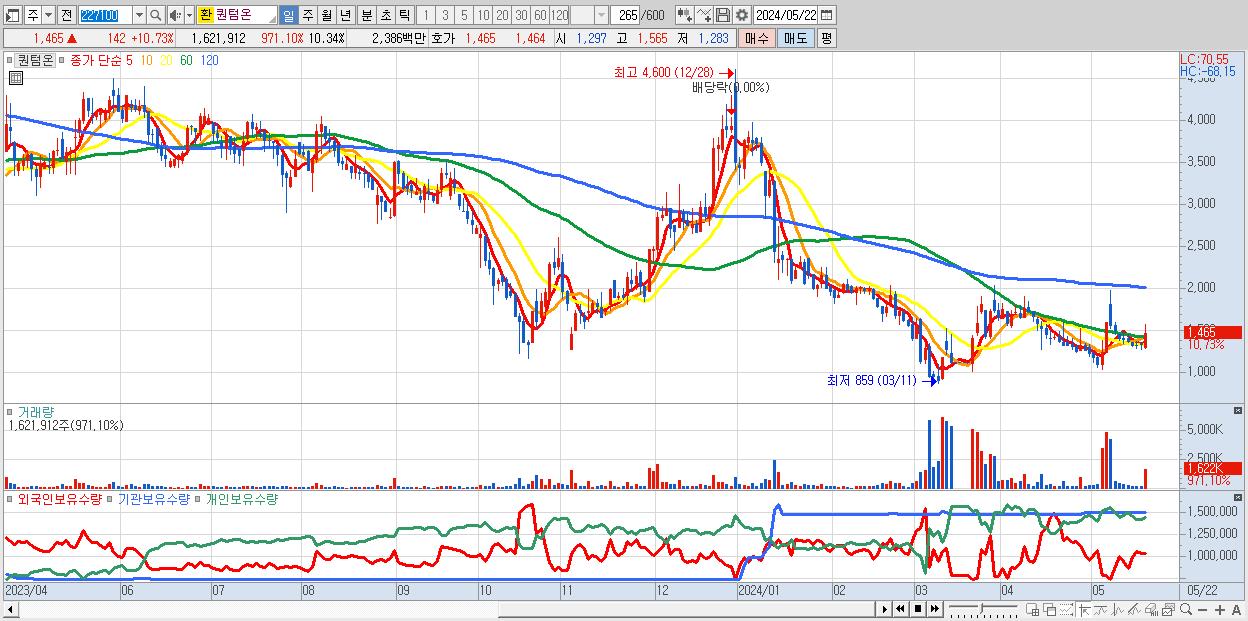 - 퀀텀온 (1,465원 ▲ 10.73% , 시총: 230억, 거래량: 1,621,912, 거래대금:24억)