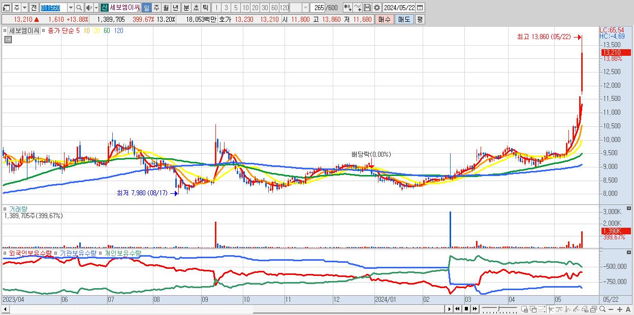 - 세보엠이씨 (13,210원 ▲ 13.88% , 시총: 1,391억, 거래량: 1,389,705, 거래대금:181억)
