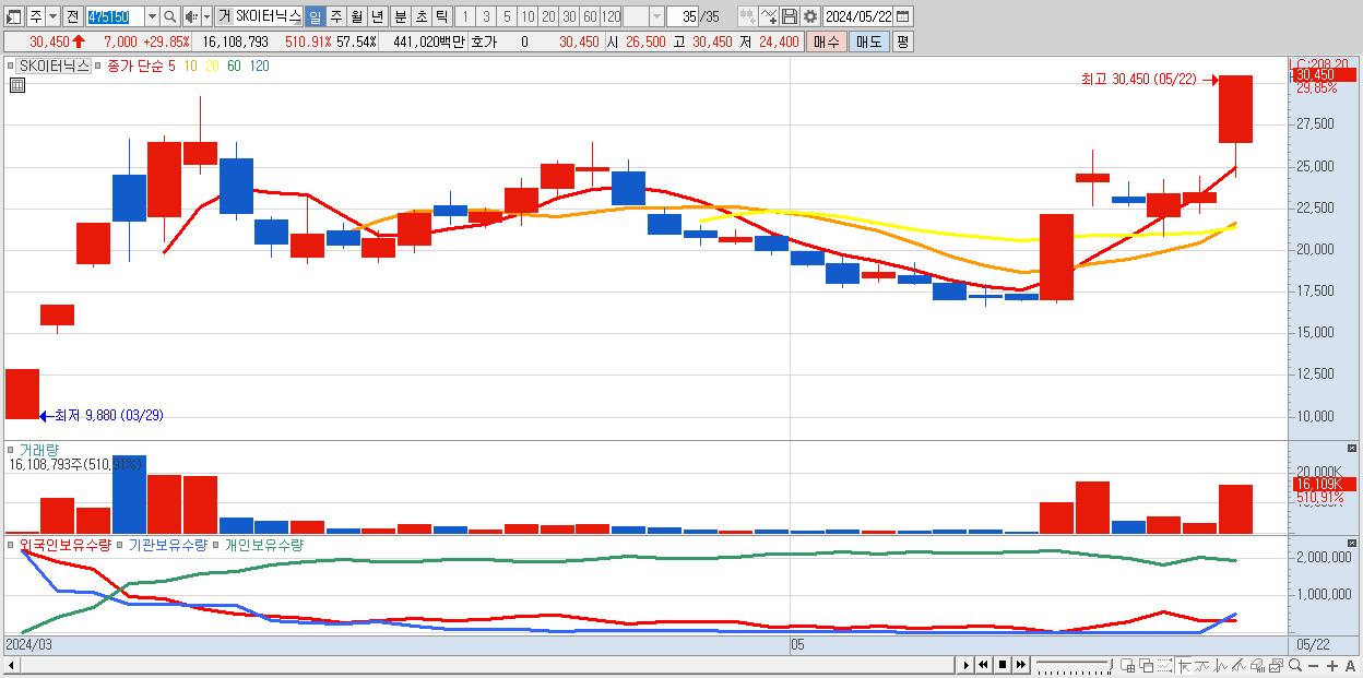 - SK이터닉스 (30,450원 ▲ 29.85% , 시총: 8,525억, 거래량: 16,108,793, 거래대금:4,410억)