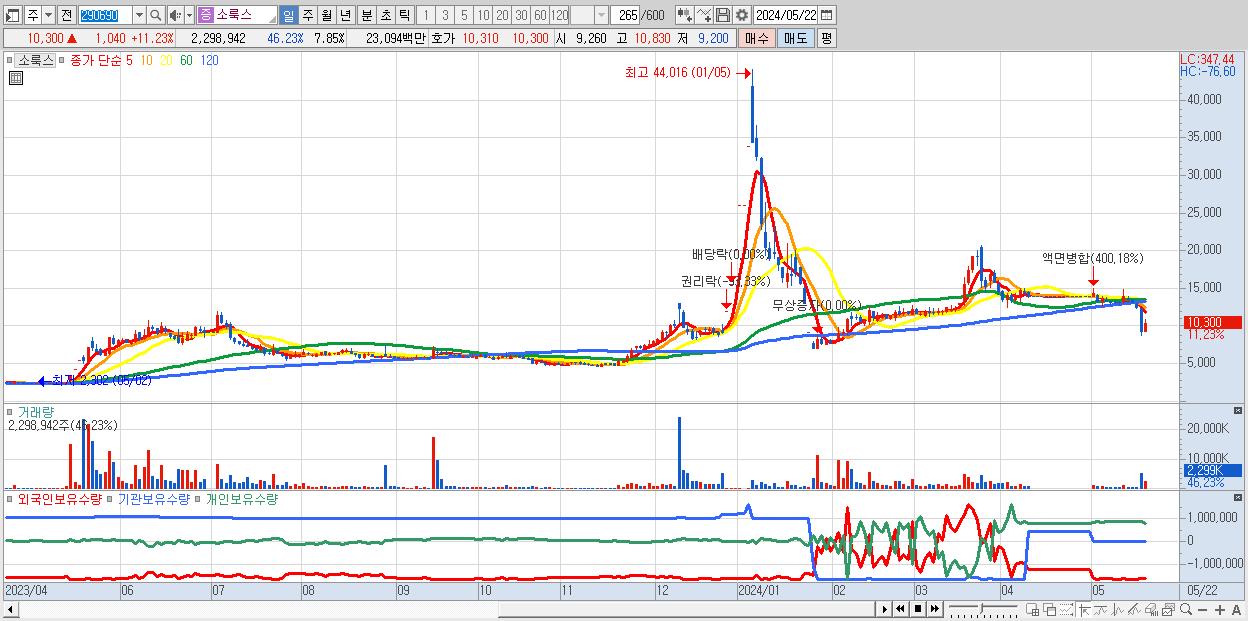 - 소룩스 (10,300원 ▲ 11.23% , 시총: 3,018억, 거래량: 2,298,942, 거래대금:231억)