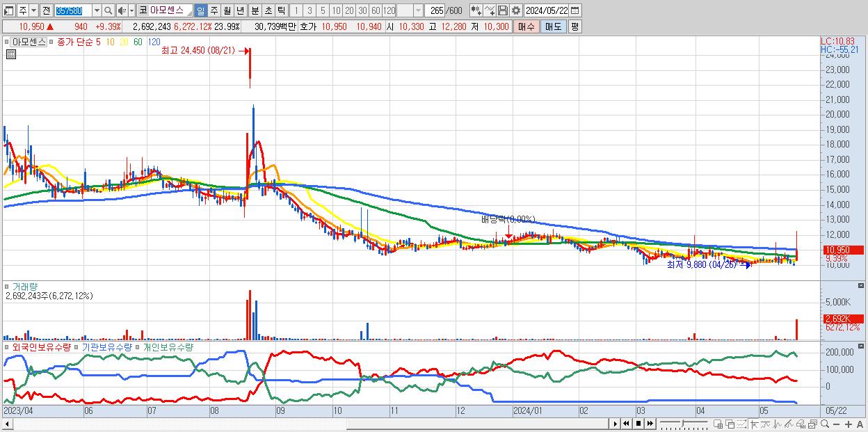 - 아모센스 (10,950원 ▲ 9.39% , 시총: 1,229억, 거래량: 2,692,243, 거래대금:307억)