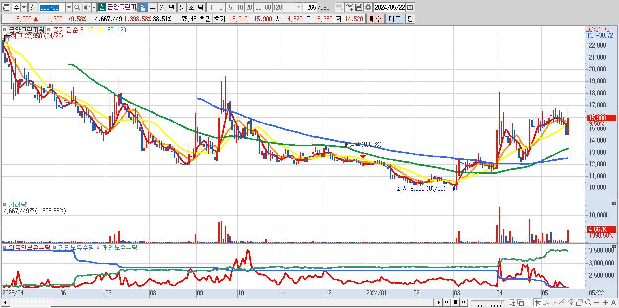 - 금양그린파워 (15,900원 ▲ 9.58% , 시총: 1,927억, 거래량: 4,667,449, 거래대금:755억)