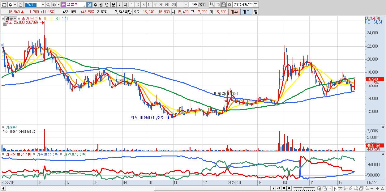 - 앱클론 (16,940원 ▲ 11.15% , 시총: 2,782억, 거래량: 463,169, 거래대금:76억)