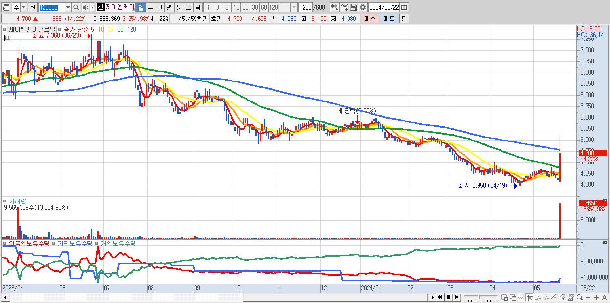 - 제이엔케이글로벌 (4,700원 ▲ 14.22% , 시총: 1,091억, 거래량: 9,565,369, 거래대금:455억)