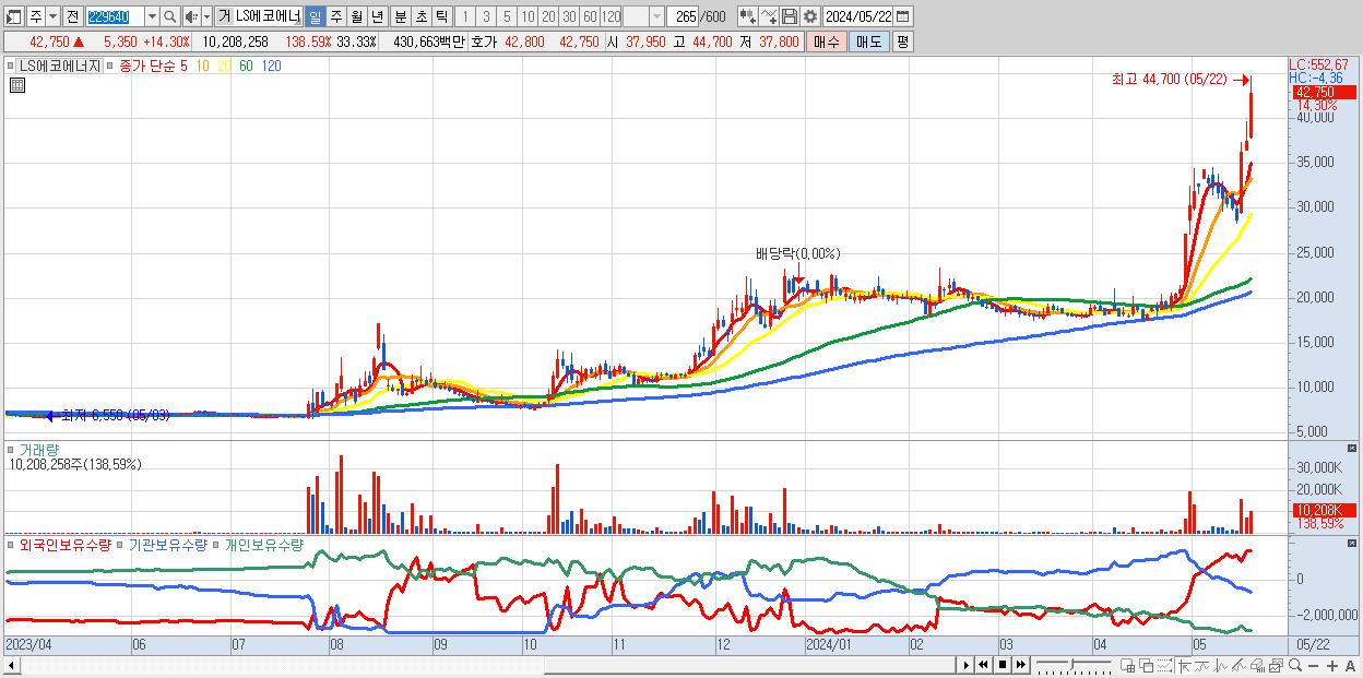 - LS에코에너지 (42,750원 ▲ 14.3% , 시총: 13,092억, 거래량: 10,208,258, 거래대금:4,307억)