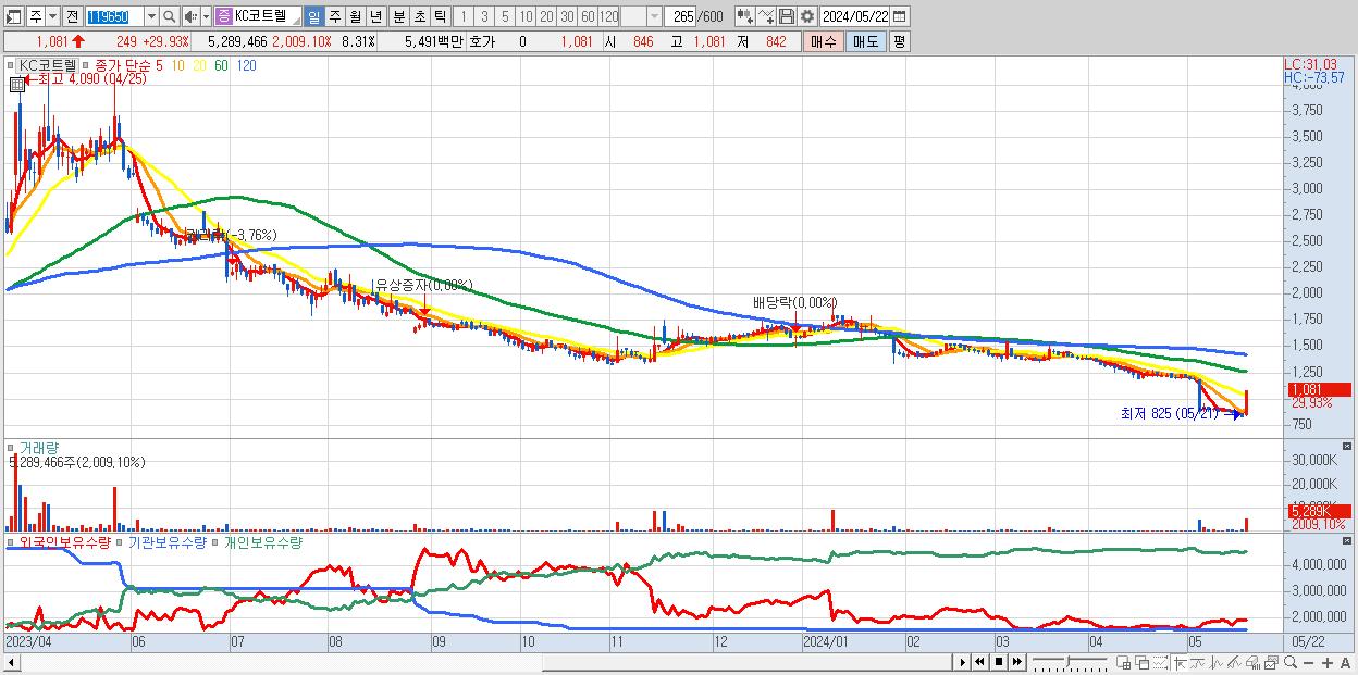 - KC코트렐 (1,081원 ▲ 29.93% , 시총: 688억, 거래량: 5,289,466, 거래대금:55억)