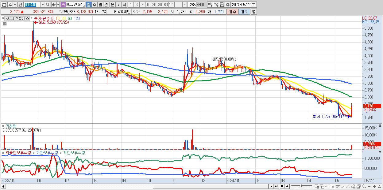 - KC그린홀딩스 (2,170원 ▲ 21.84% , 시총: 487억, 거래량: 2,955,635, 거래대금:64억)