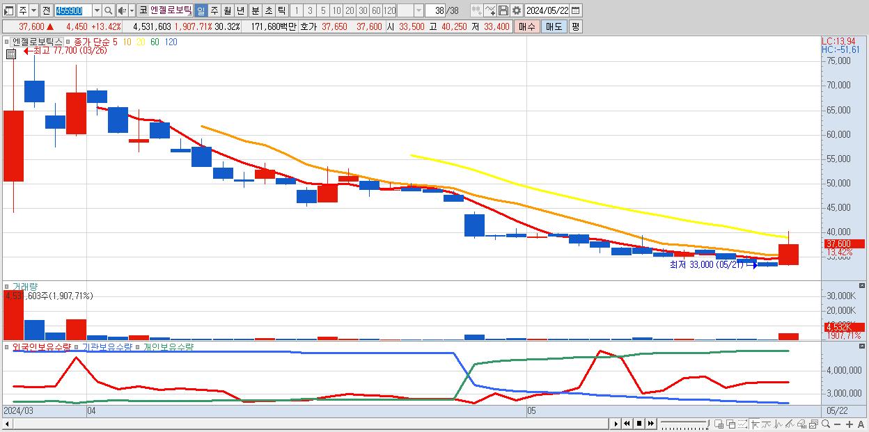 - 엔젤로보틱스 (37,600원 ▲ 13.42% , 시총: 5,619억, 거래량: 4,531,603, 거래대금:1,717억)