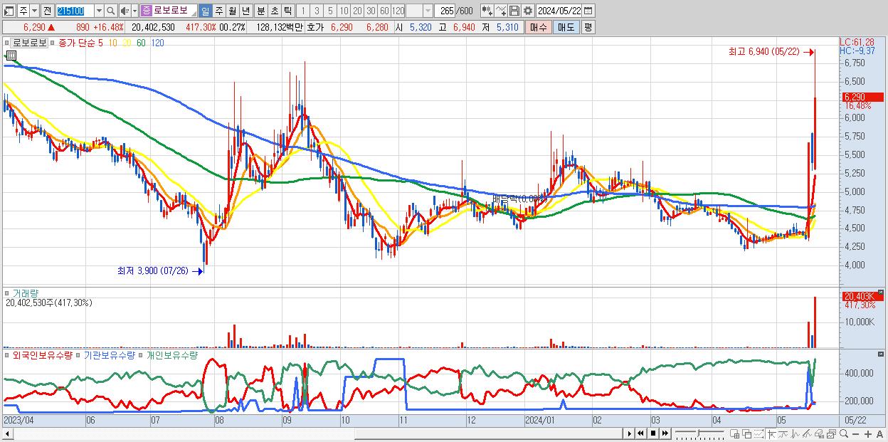 - 로보로보 (6,290원 ▲ 16.48% , 시총: 1,280억, 거래량: 20,402,530, 거래대금:1,281억)