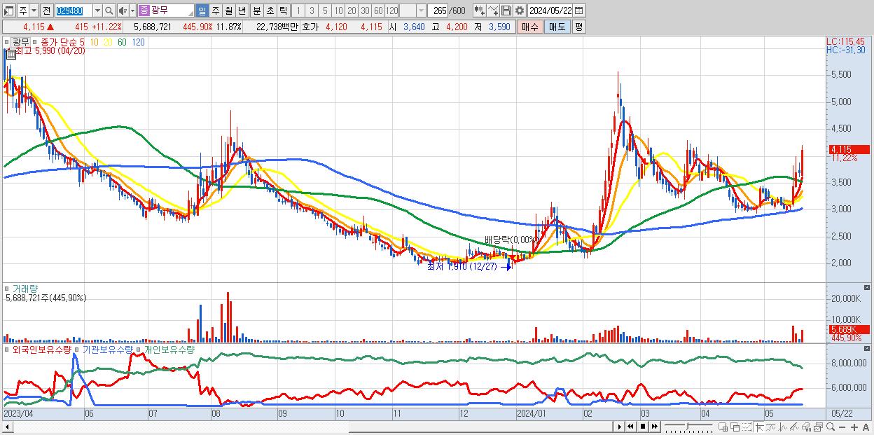 - 광무 (4,115원 ▲ 11.22% , 시총: 1,971억, 거래량: 5,688,721, 거래대금:227억)