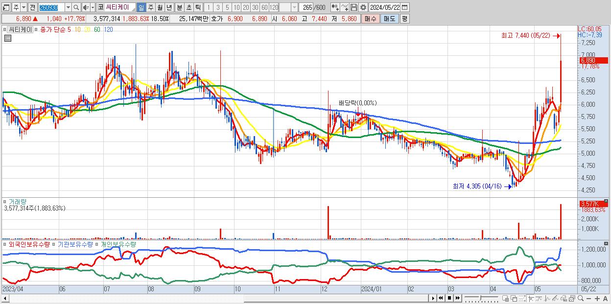 - 씨티케이 (6,890원 ▲ 17.78% , 시총: 1,333억, 거래량: 3,577,314, 거래대금:251억)