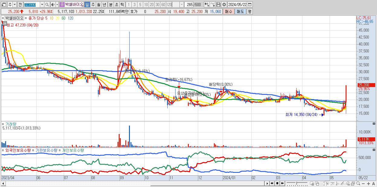 - 박셀바이오 (25,200원 ▲ 29.96% , 시총: 5,794억, 거래량: 5,117,103, 거래대금:1,118억)