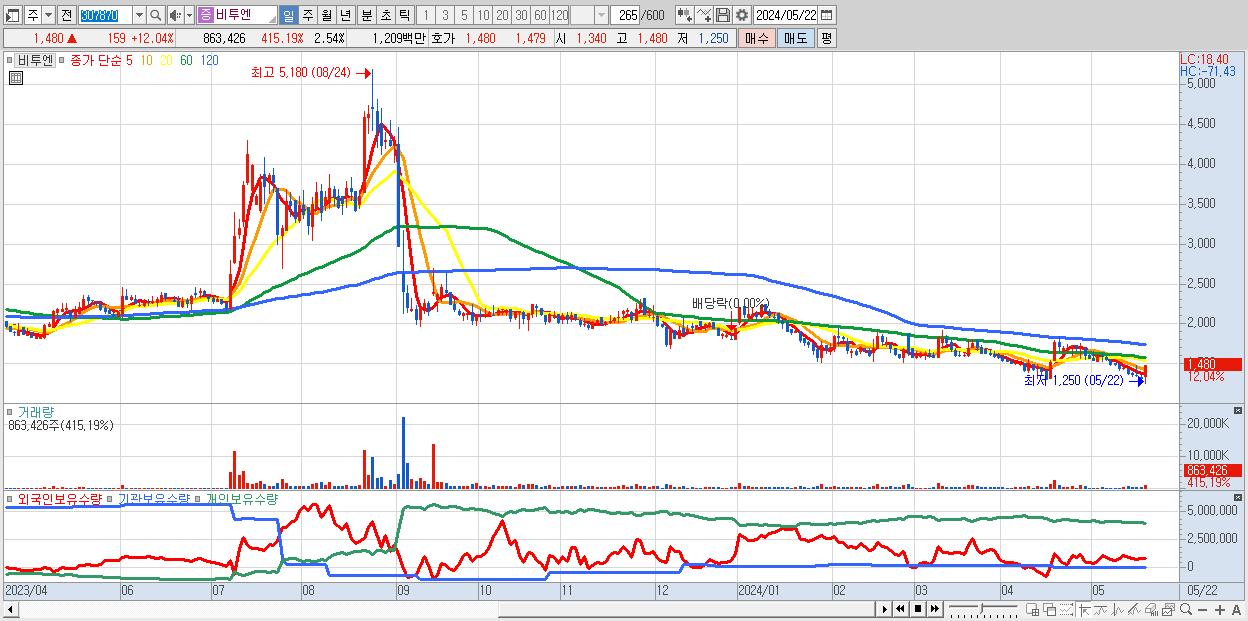- 비투엔 (1,480원 ▲ 12.04% , 시총: 503억, 거래량: 863,426, 거래대금:12억)
