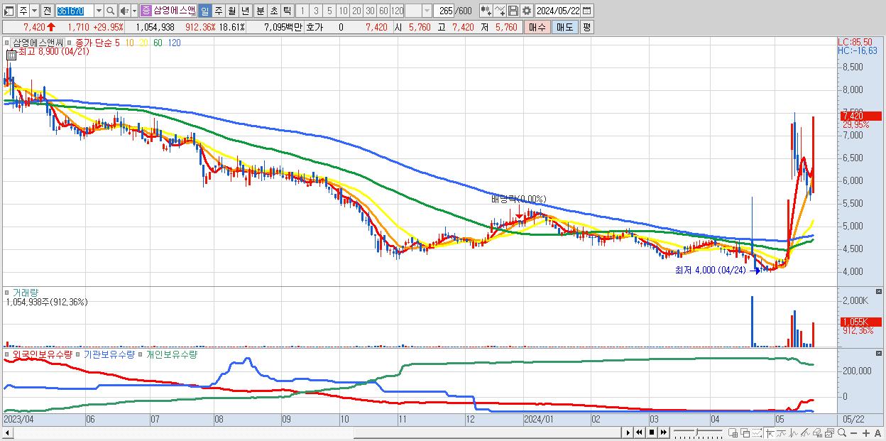- 삼영에스앤씨 (7,420원 ▲ 29.95% , 시총: 421억, 거래량: 1,054,938, 거래대금:71억)