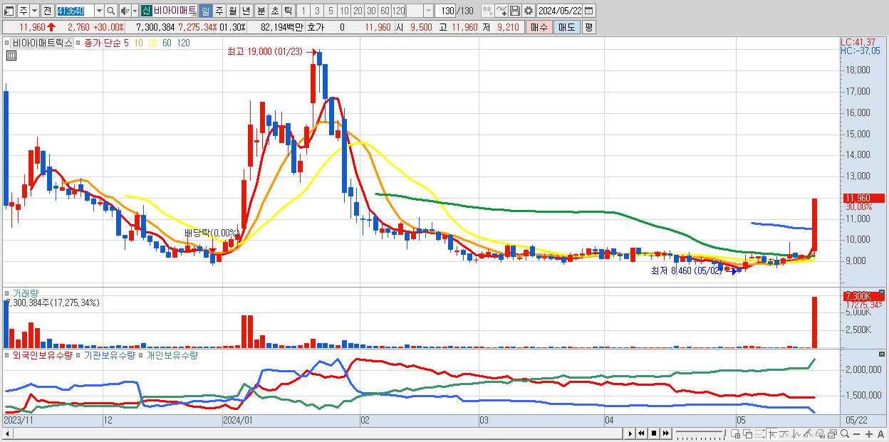 - 비아이매트릭스 (11,960원 ▲ 30% , 시총: 862억, 거래량: 7,300,384, 거래대금:822억)