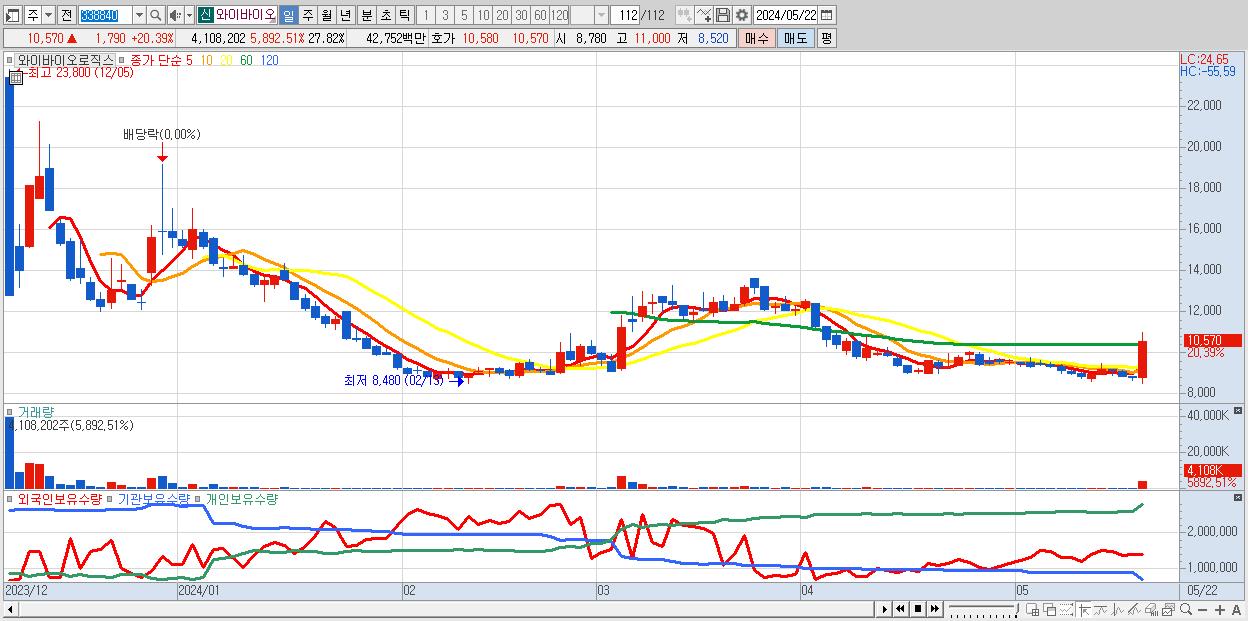 - 와이바이오로직스 (10,570원 ▲ 20.39% , 시총: 1,561억, 거래량: 4,108,202, 거래대금:428억)
