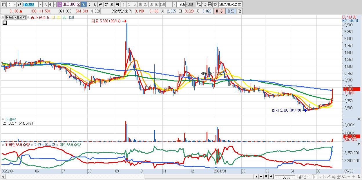 - 애드바이오텍 (3,180원 ▲ 11.58% , 시총: 291억, 거래량: 321,362, 거래대금:10억)
