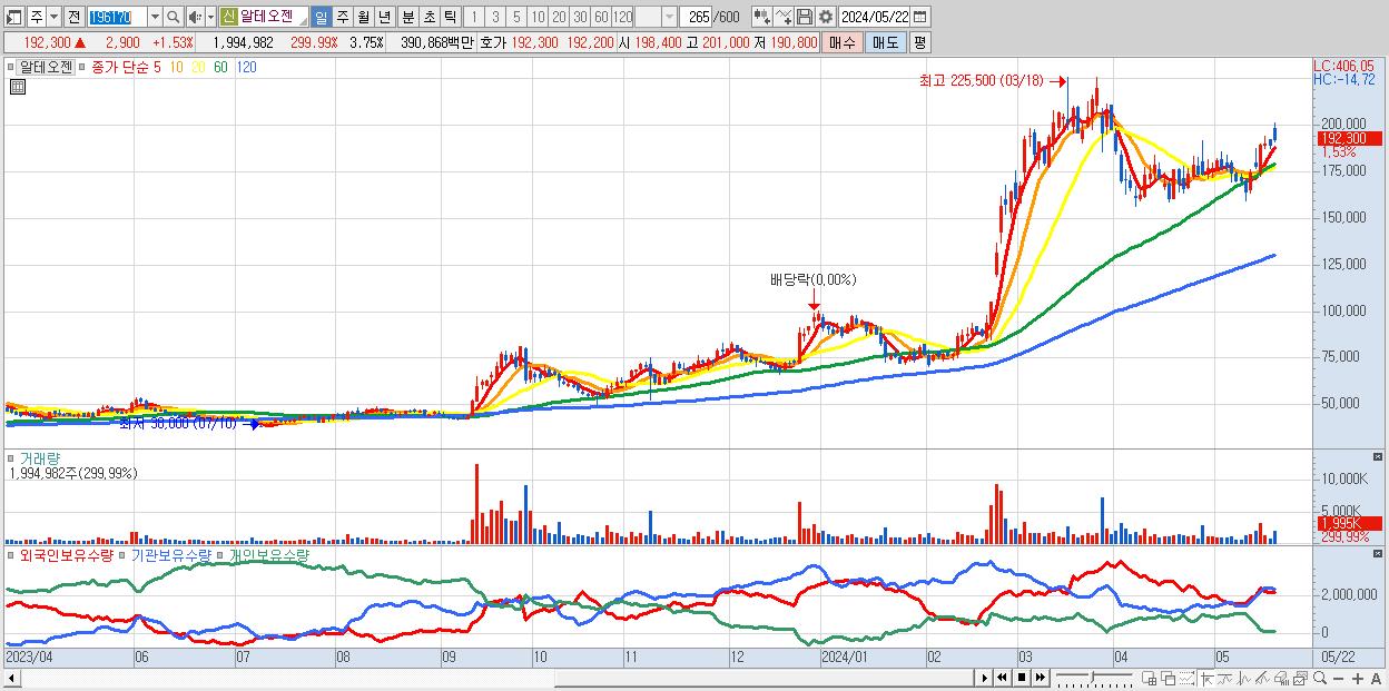 - 알테오젠 (192,300원 ▲ 1.53% , 시총: 102,205억, 외국인 순매수 거래금:51억)