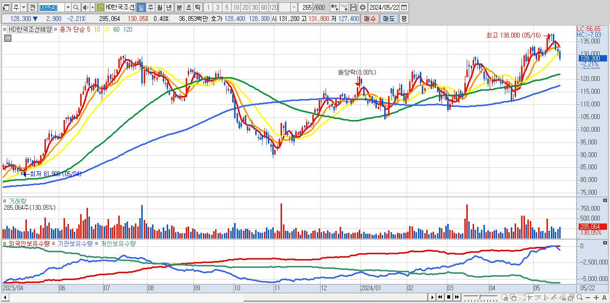 - HD한국조선해양 (128,300원 ▼ -2.21% , 시총: 90,802억, 외국인 순매수 거래금:85억)
