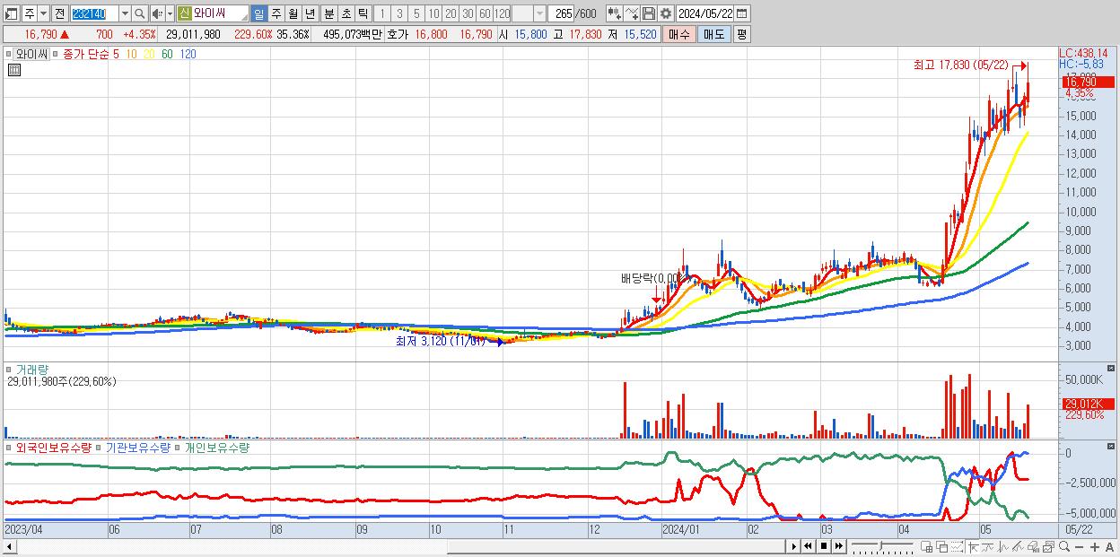 - 와이씨 (16,790원 ▲ 4.35% , 시총: 13,775억, 외국인 순매수 거래금:71억)