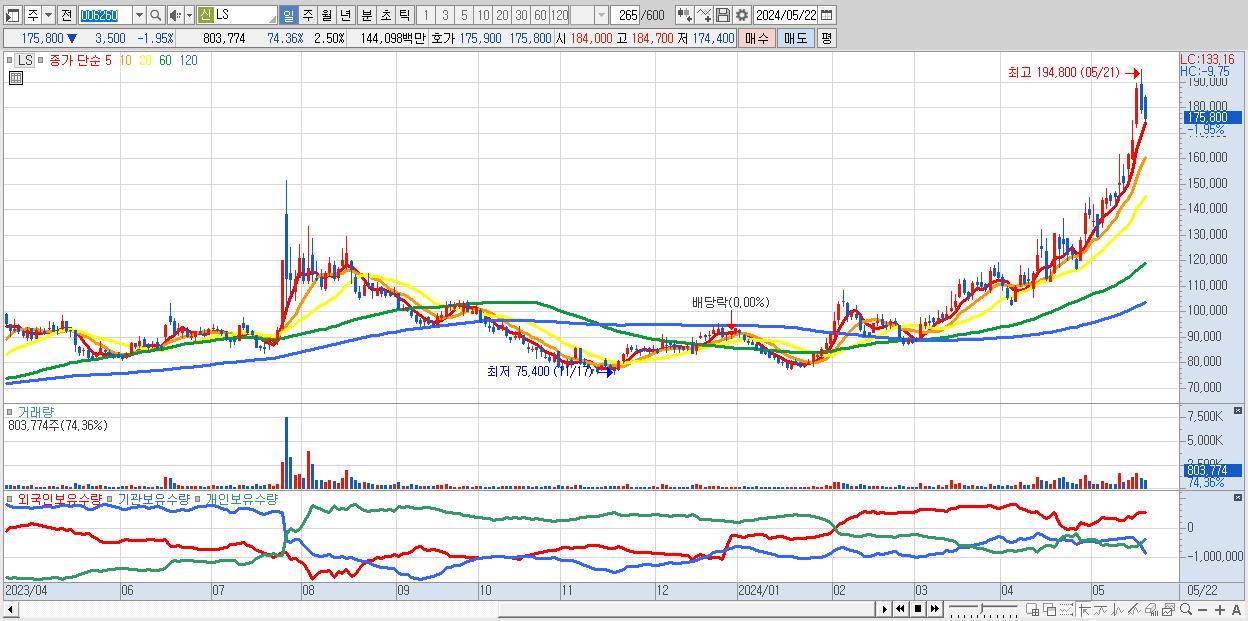 - LS (175,800원 ▼ -1.95% , 시총: 56,608억, 외국인 순매수 거래금:128억)