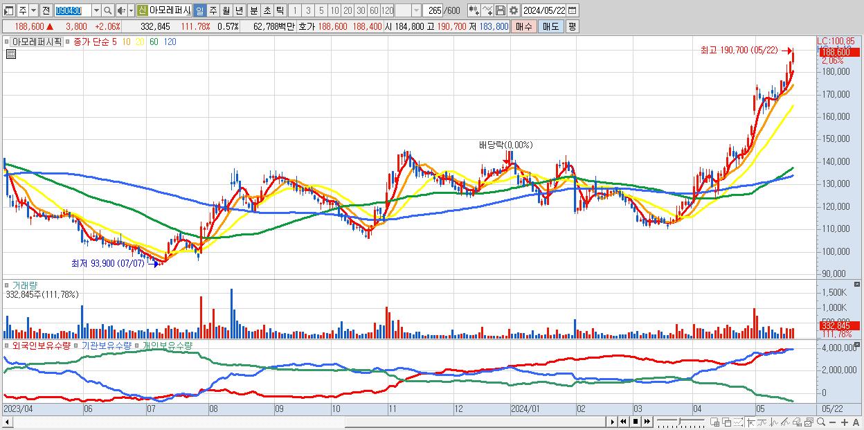 - 아모레퍼시픽 (188,600원 ▲ 2.06% , 시총: 110,317억, 외국인 순매수 거래금:174억)