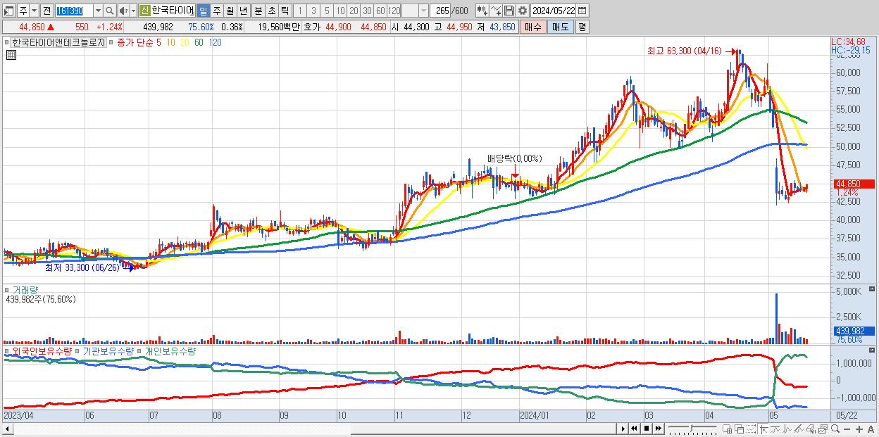 - 한국타이어앤테크놀로지 (44,850원 ▲ 1.24% , 시총: 55,558억, 외국인 순매수 거래금:53억)