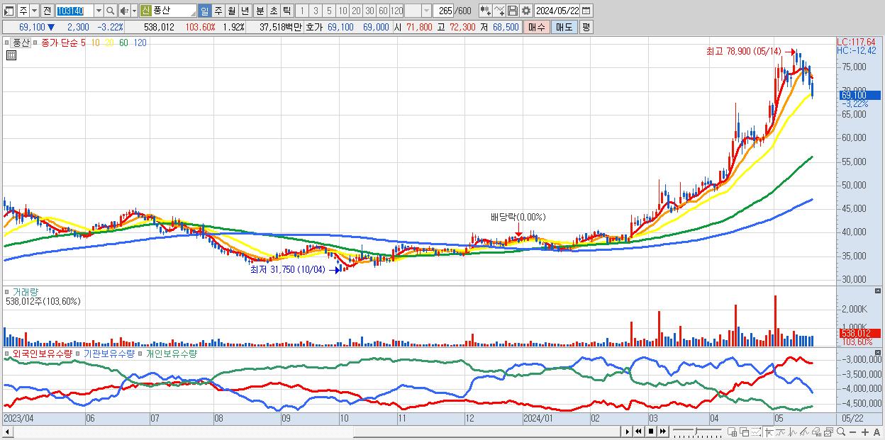- 풍산 (69,100원 ▼ -3.22% , 시총: 19,365억, 외국인 순매수 거래금:59억)