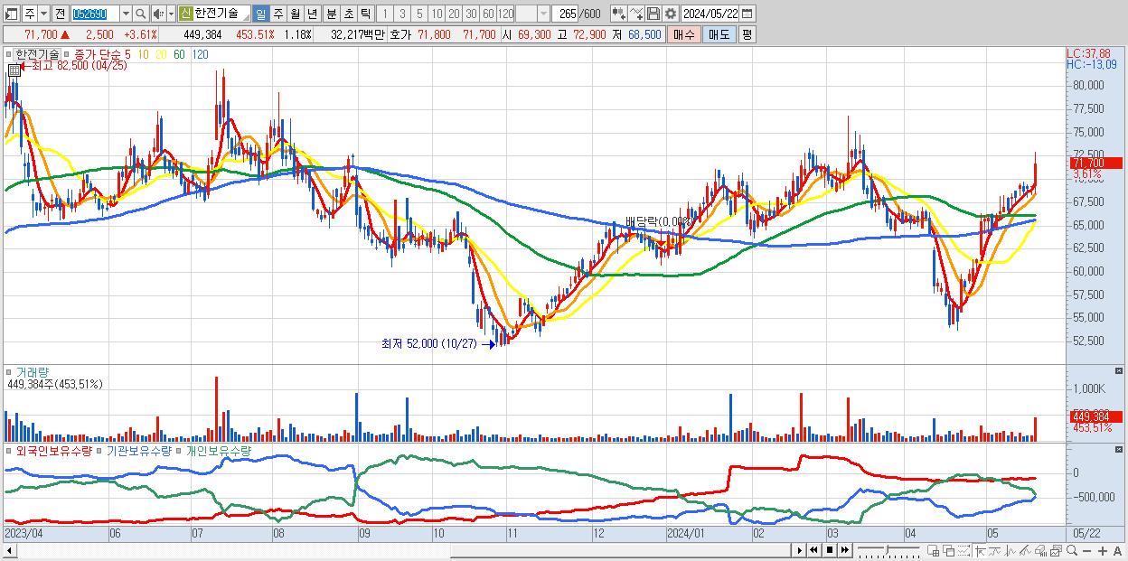 - 한전기술 (71,700원 ▲ 3.61% , 시총: 27,404억, 외국인 순매수 거래금:73억)