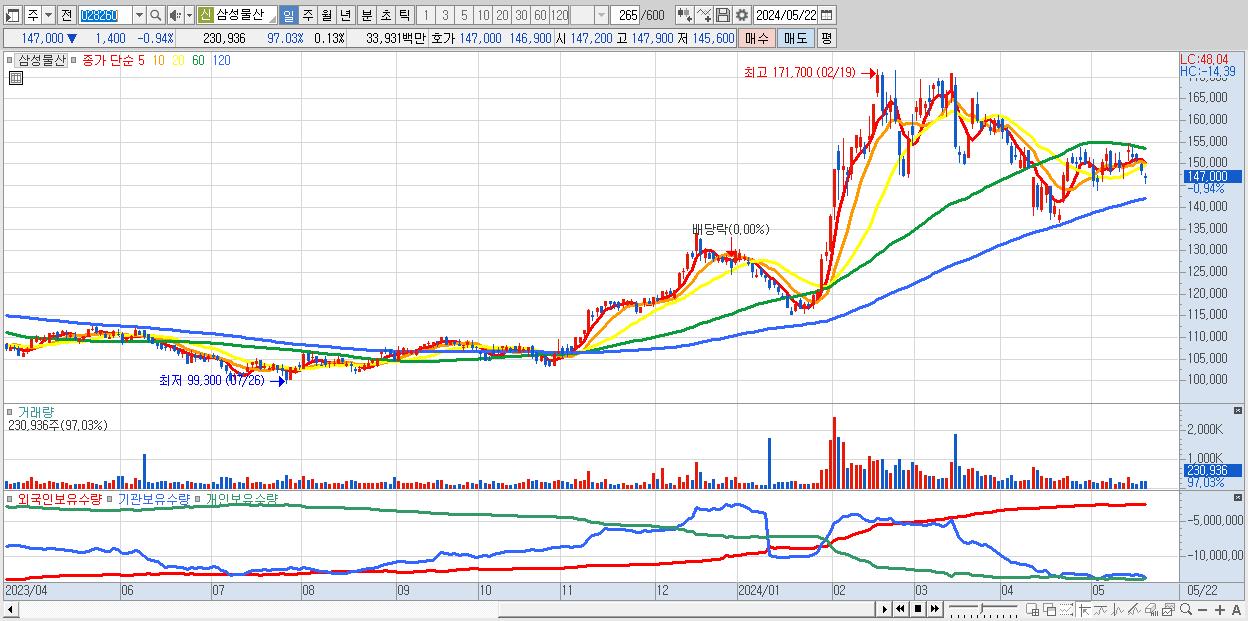 - 삼성물산 (147,000원 ▼ -0.94% , 시총: 261,343억, 외국인 순매수 거래금:52억)