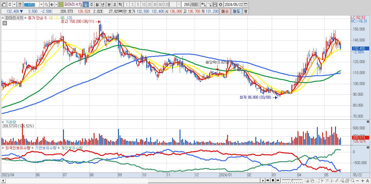 - 파마리서치 (132,400원 ▼ -2.58% , 시총: 13,742억, 외국인 순매수 거래금:40억)