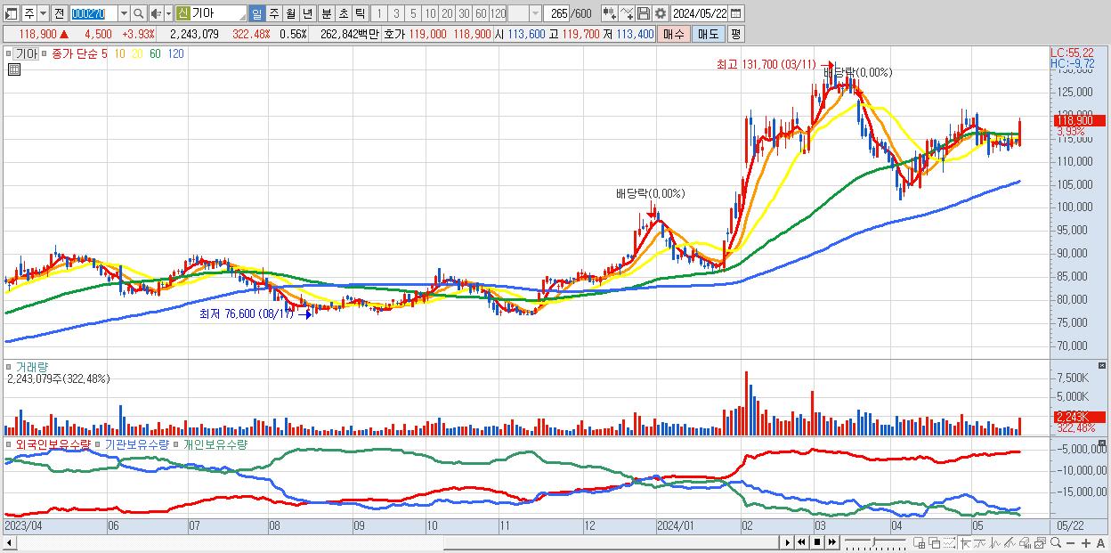- 기아 (118,900원 ▲ 3.93% , 시총: 478,031억, 외국인 순매수 거래금:246억)