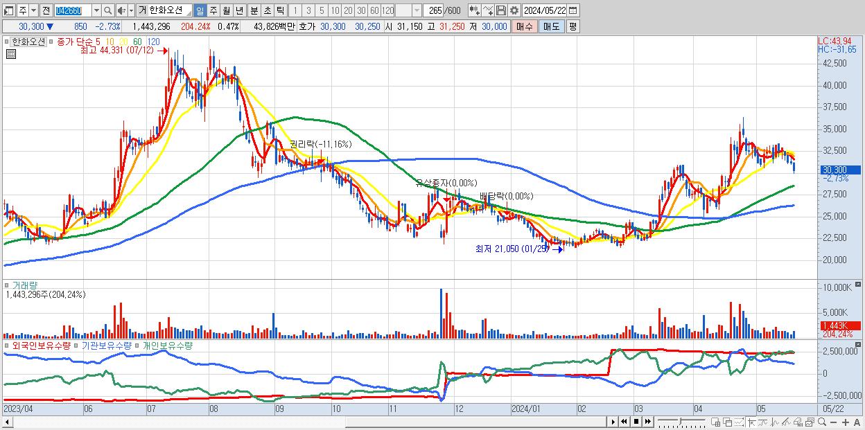 - 한화오션 (30,300원 ▼ -2.73% , 시총: 92,827억, 외국인 순매수 거래금:41억)