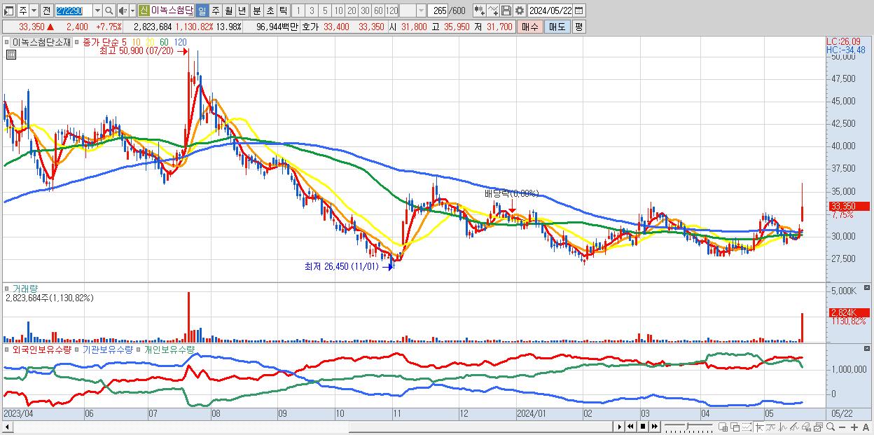 - 이녹스첨단소재 (33,350원 ▲ 7.75% , 시총: 6,737억, 외국인 순매수 거래금:69억)