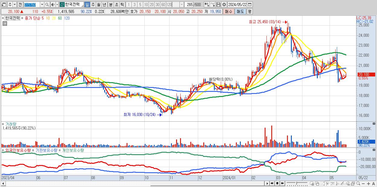 - 한국전력 (20,100원 ▲ 0.55% , 시총: 129,035억, 외국인 순매수 거래금:89억)