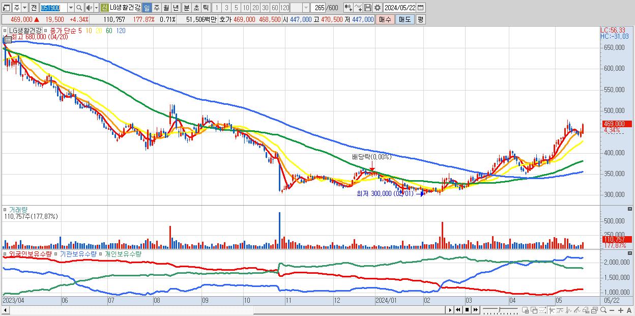 - LG생활건강 (469,000원 ▲ 4.34% , 시총: 73,249억, 외국인 순매수 거래금:71억)