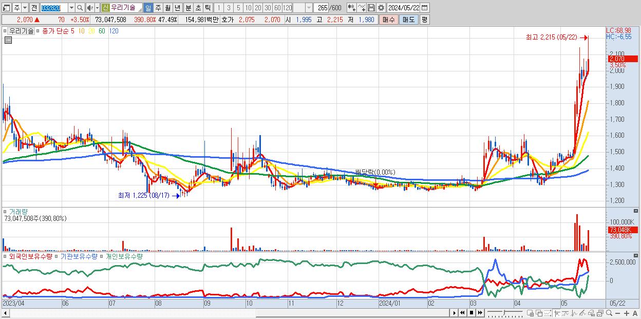 - 우리기술 (2,070원 ▲ 3.5% , 시총: 3,184억, 거래량: 73,047,508, 거래대금:1,550억)