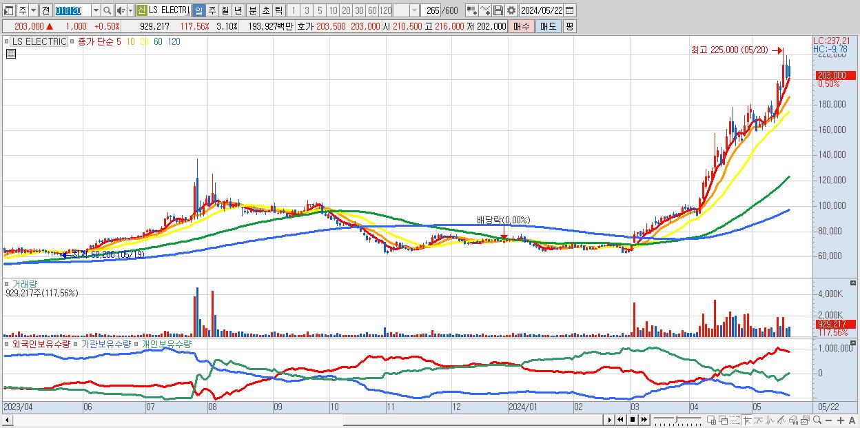 - LS ELECTRIC (203,000원 ▲ 0.5% , 시총: 60,900억, 거래량: 929,217, 거래대금:1,939억)