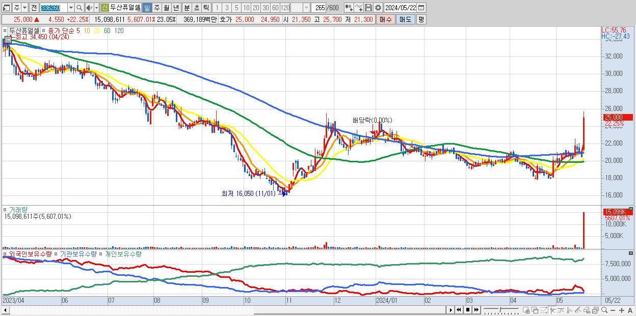 - 두산퓨얼셀 (25,000원 ▲ 22.25% , 시총: 16,373억, 거래량: 15,098,611, 거래대금:3,692억)
