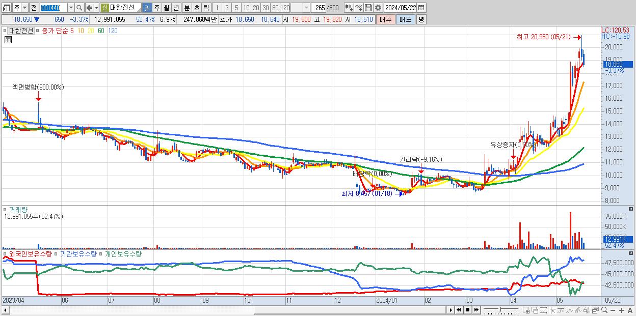 - 대한전선 (18,650원 ▼ -3.37% , 시총: 34,772억, 거래량: 12,991,055, 거래대금:2,479억)