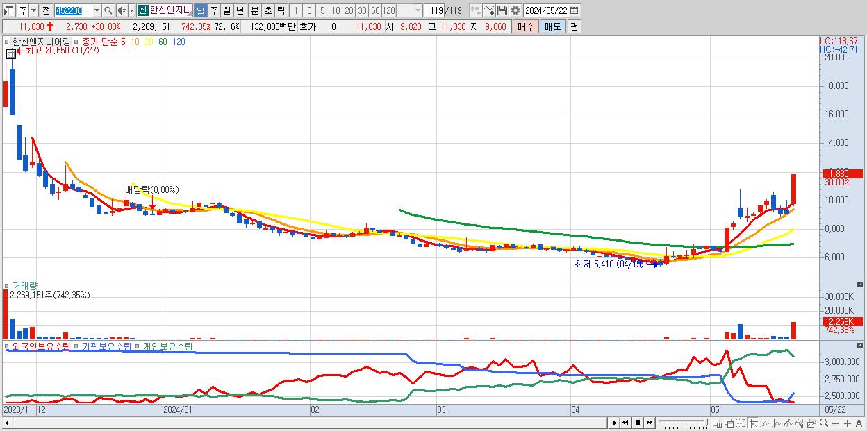 - 한선엔지니어링 (11,830원 ▲ 30% , 시총: 2,011억, 거래량: 12,269,151, 거래대금:1,328억)