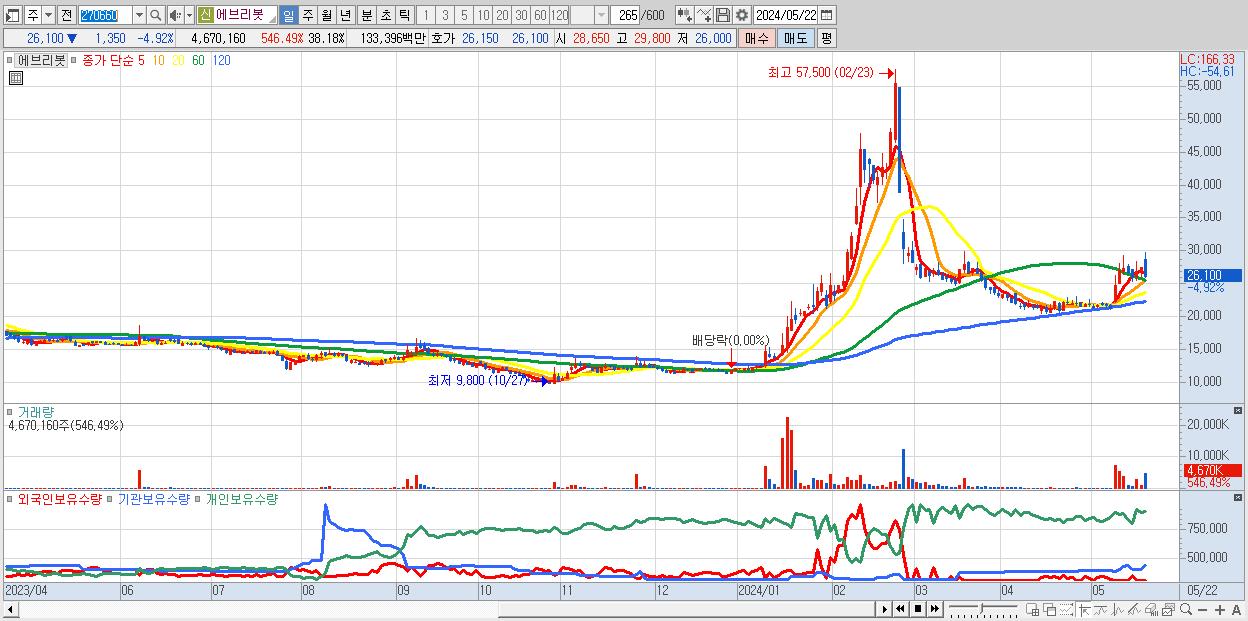 - 에브리봇 (26,100원 ▼ -4.92% , 시총: 3,192억, 거래량: 4,670,160, 거래대금:1,334억)