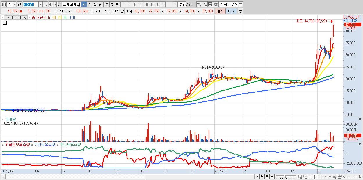 - LS에코에너지 (42,750원 ▲ 14.3% , 시총: 13,092억, 거래량: 10,284,164, 거래대금:4,339억)